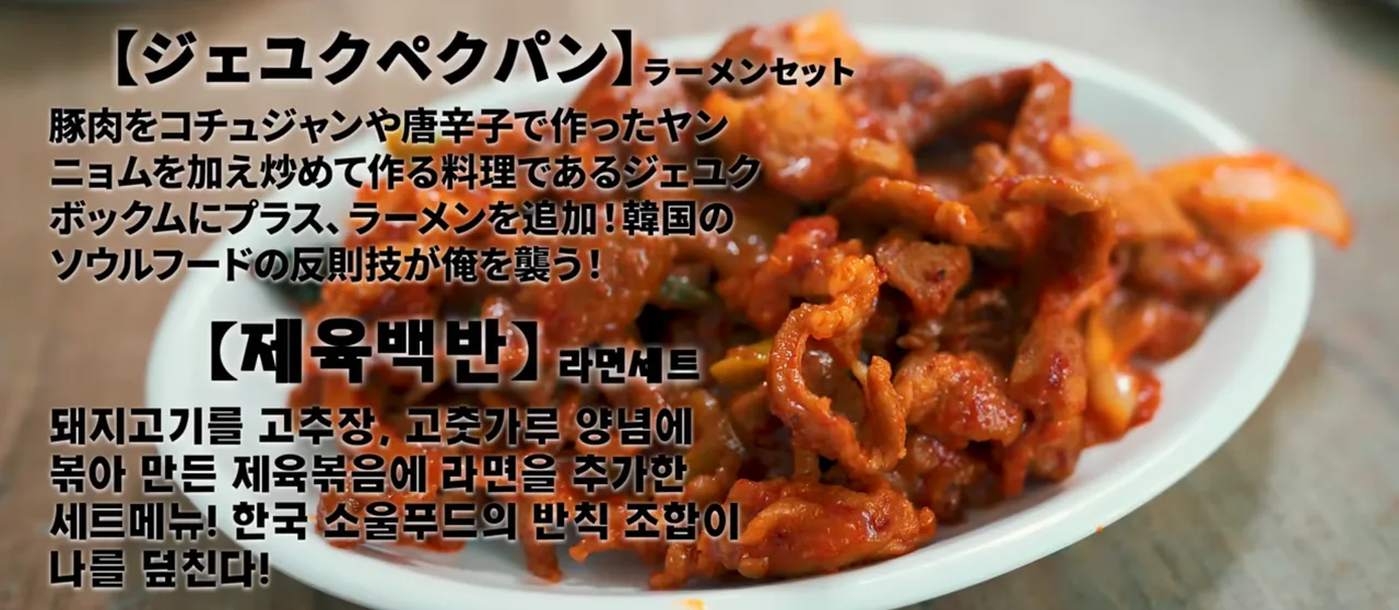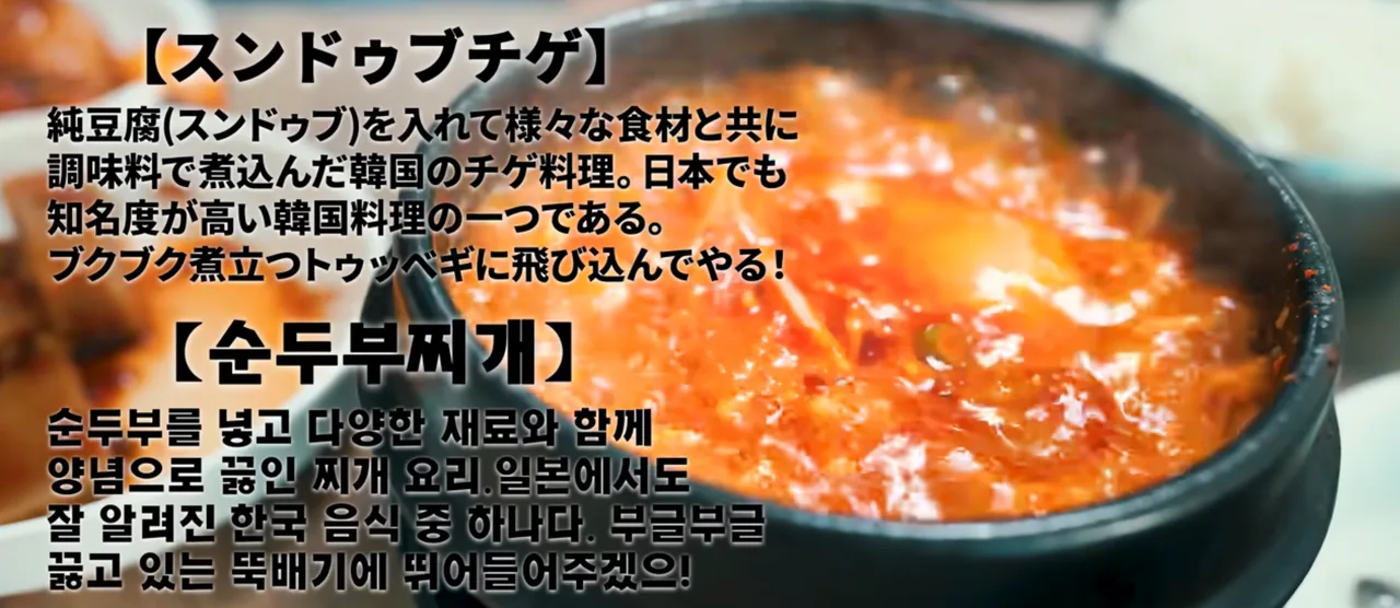 動画では チェユク+ラーメンセットスンドゥブチゲが紹介されました。おかずからして“家ごはん”感満点で、チュィナムル、エリンギ(またはキノコ炒め)、ワラビの和え物、ドトリムク(どんぐりこんにゃく)、白菜キムチ、そして 韓国海苔と醤油まで。見ただけでほっとする構成です。