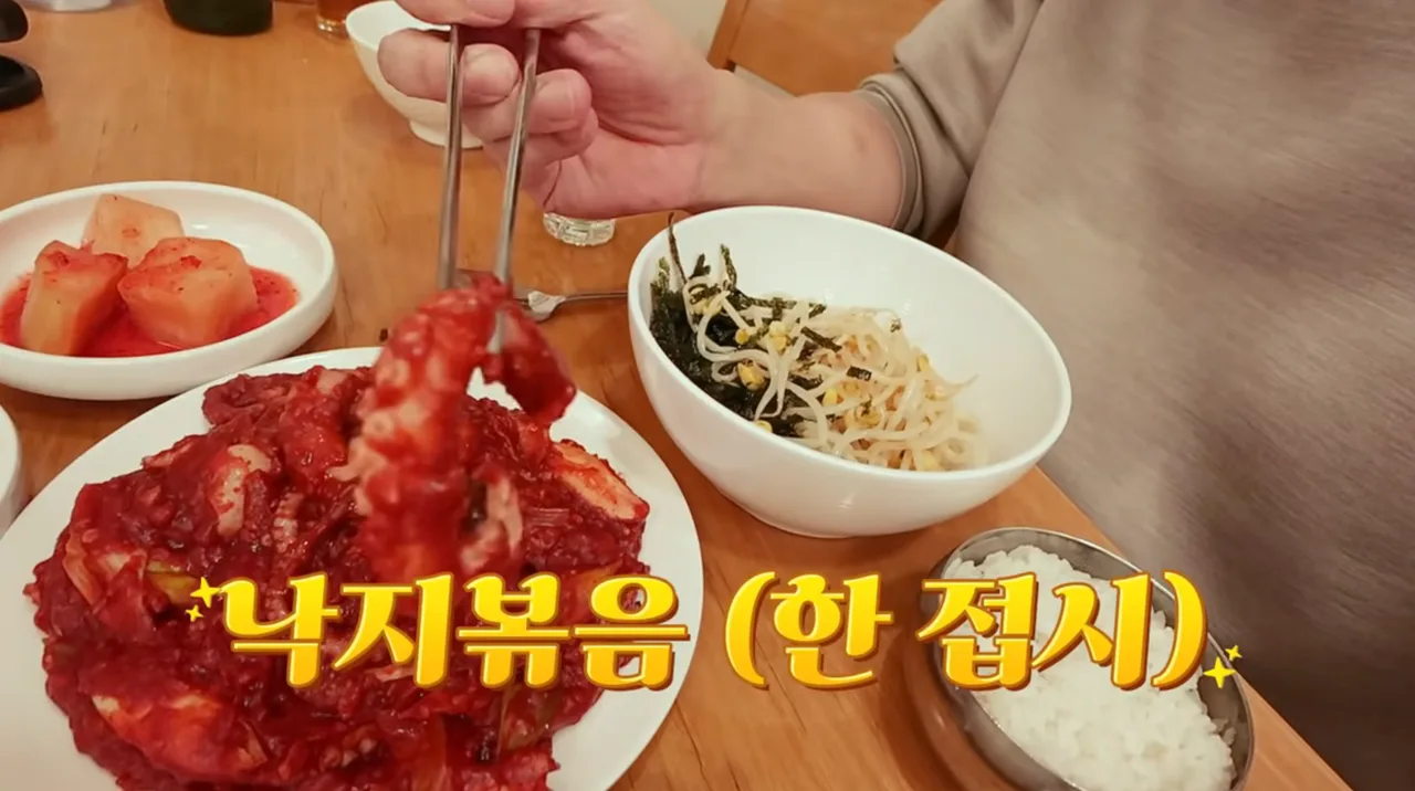 看板メニューのナクチポックム(辛い炒めダコ)は、真っ赤なヤンニョムがしっかり絡んで登場。タコはぷりっと弾力があって、ピリ辛の味付けはまさに“韓国人が好きなあの味”。途中からご飯と混ぜてビビンバ風にすると、もうそれだけで満足度MAXです。