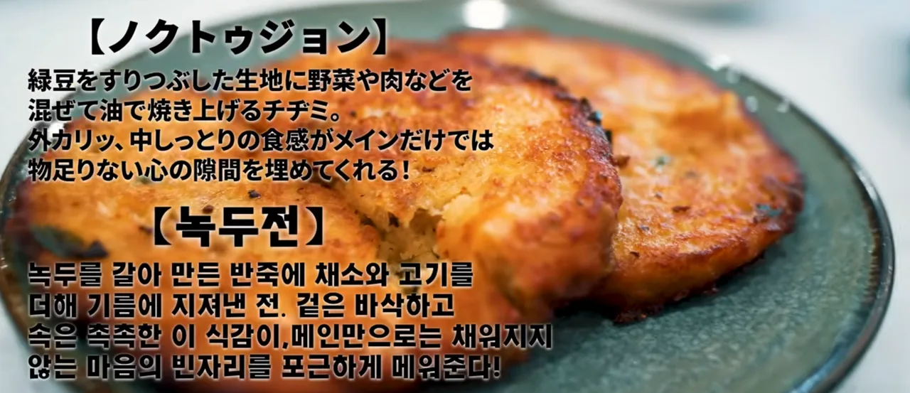 함께 주문한 녹두전도 사이드로 추천할 만합니다. 녹두를 갈아 만든 반죽에 채소와 고기를 더해 노릇하게 부쳐낸 전으로, 겉은 바삭하고 속은 촉촉한 ‘겉바속촉’ 식감이 포인트예요. 한입 베어물면 부담스럽게 기름지지 않고 담백하게 고소한 맛이 살아있고, 같이 나온 소스에 찍어 먹으면 풍미가 더 살아납니다. 아주 독특한 맛이라기보다는, 수제로 만든 듯한 푸근하고 묵직한 매력이 있는 스타일이라고 해요.팁 하나! 밑반찬으로 나오는 양파절임을 녹두전 위에 올려 함께 먹으면 느끼함을 잡아줘서 더 맛있게 즐길 수 있습니다.