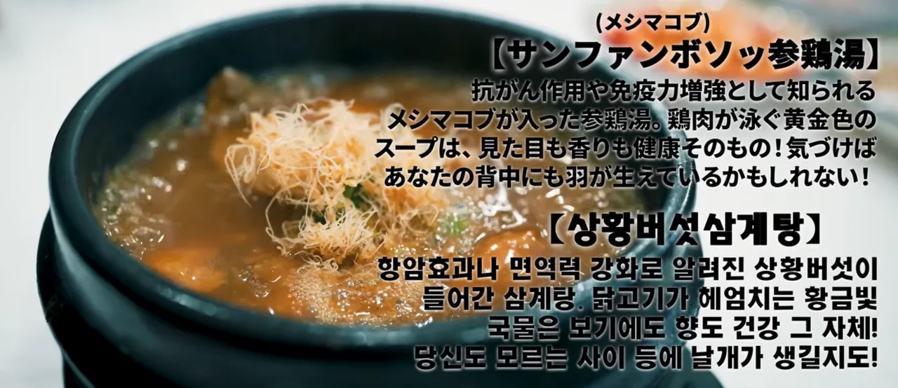 영상에서 소개된 메뉴는 상황버섯 삼계탕과 녹두전이었습니다.