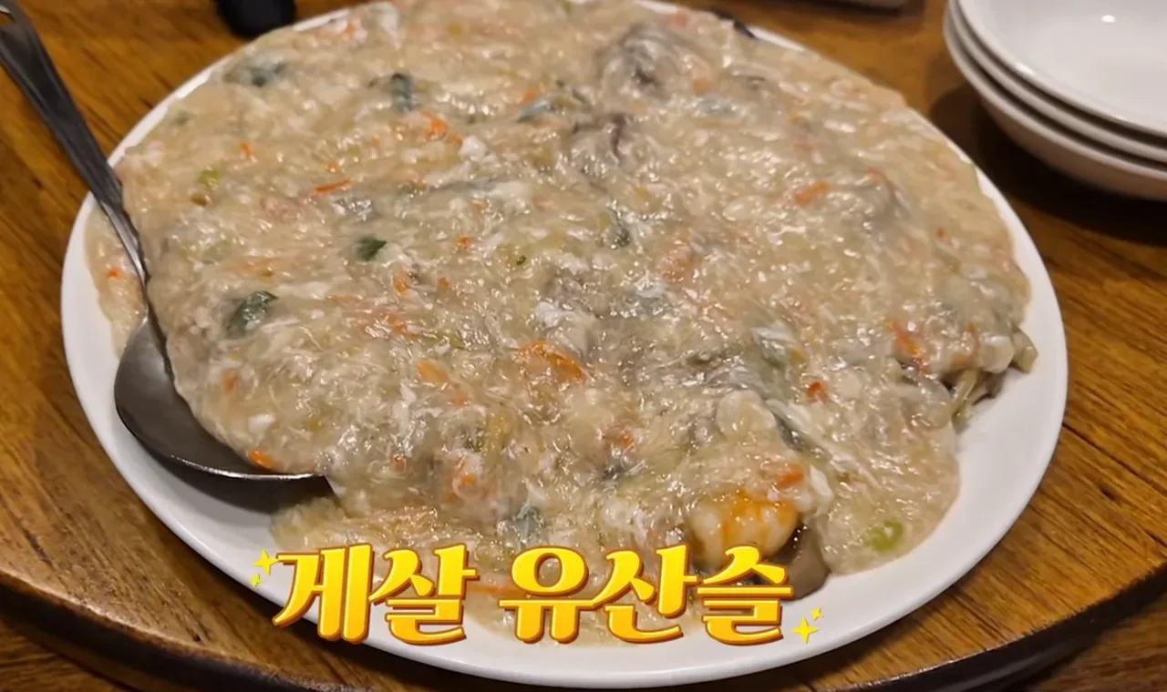 Món thứ ba là yusansul thịt cua (게살 유산슬)—món xào sệt với thịt cua, hải sản và rau củ. Ngon đến mức vừa ăn đã phải trầm trồ, và được giới thiệu như một món nhất định phải thử khi đến đây. Mẹo nhỏ: rưới một chút dầu ớt lên trên, hương vị sẽ “bật” lên rõ rệt.