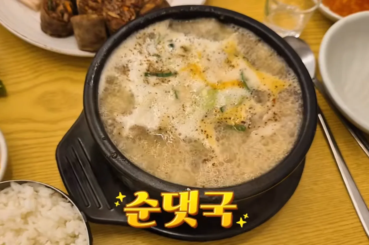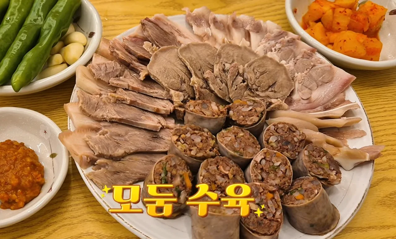 视频里首先介绍的是拼盘水肉(모둠수육)。拼盘里会有不同部位的水肉——比如猪舌(돈설)/颈后肉(뒷덜미살)/猪耳(귀),还会搭配白岩顺带一起上桌,同时还会另外提供一份顺带汤饭用的汤底。不同部位口感差异很明显,边吃边比较会更有意思。如果想蘸盐吃,可以跟店里另外要盐,他们会拿给你。还有不少评价提到这里把腥味/膻味处理得很好,平时因为味道原因不太敢吃水肉的人也值得试试。